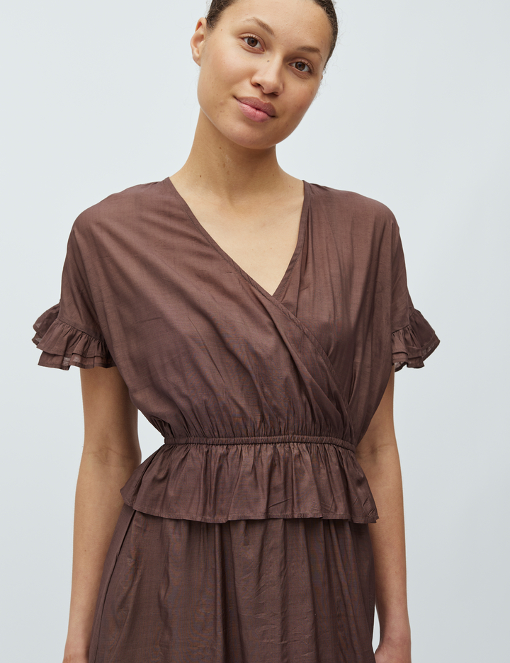 Hoe mooi is deze bruine jurk van mbyM? De jurk valt goed op maat, heeft korte mouwen en valt slank in de taille. Prachtig!
